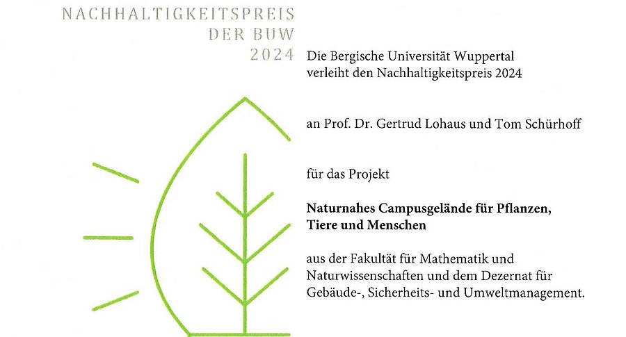 Am 03.06.2025 wurde für das Projekt „Naturnahes Campusgelände für Pflanzen, Tiere und Menschen“ der Nachhaltigkeitspreis der BUW 2024 an Tom Schürhoff (Dez. 5) und Prof’in Dr. Gertrud Lohaus (AG Botanik) vergeben